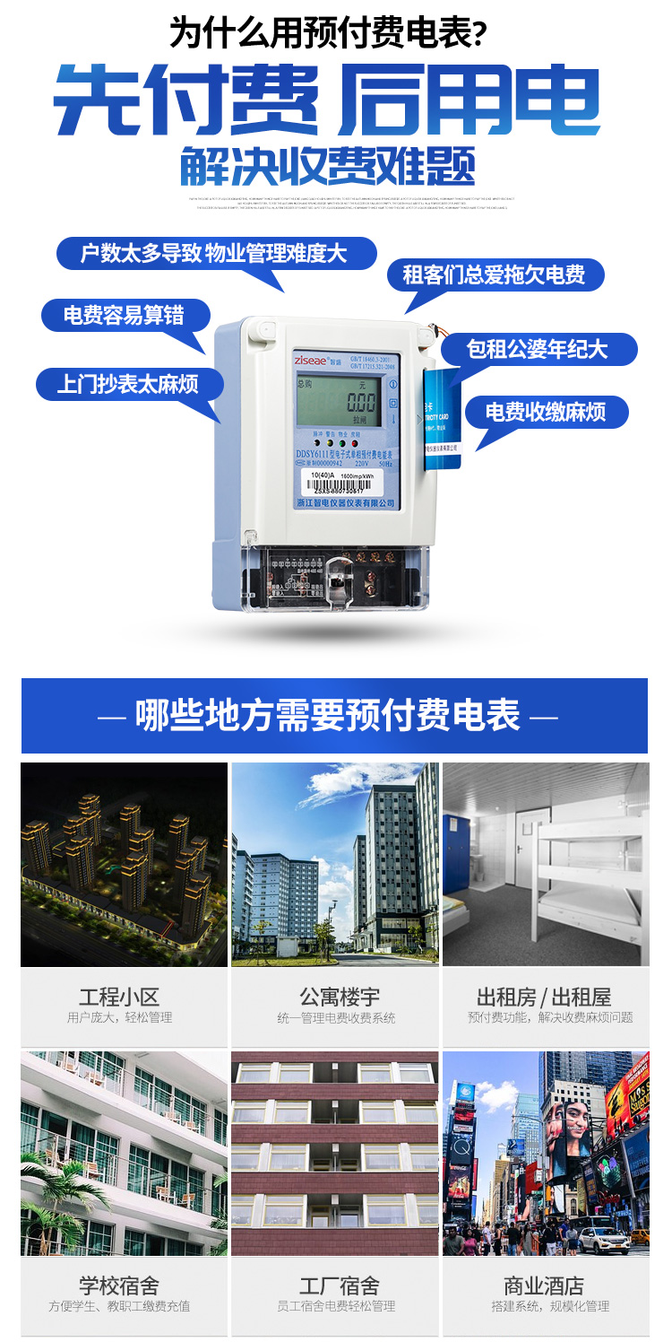 (4)預付費電度表適用的場所:工程小區用戶-龐大輕松管理,公寓樓宇-統一管理收費系統,出租房或出租屋-預付費功能解決收費麻煩問題,學校宿舍-方便學生教職工收費充值,工廠宿舍-員工宿舍電費管理,商業酒店-搭建系統規模化管理等具體如下。